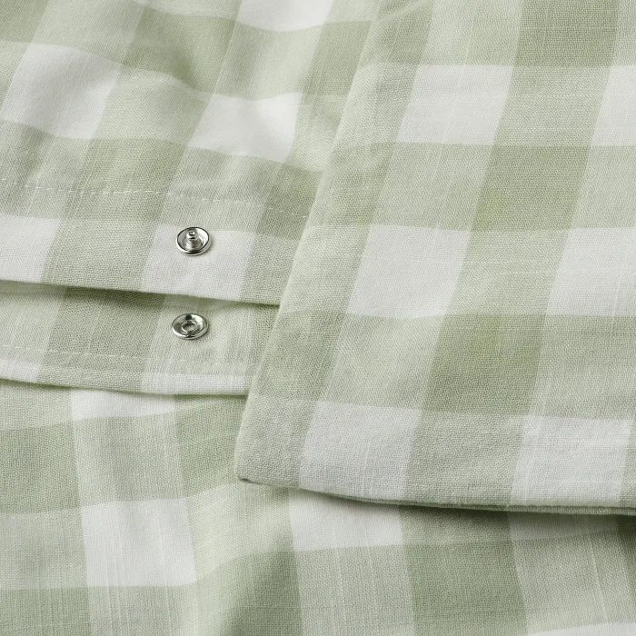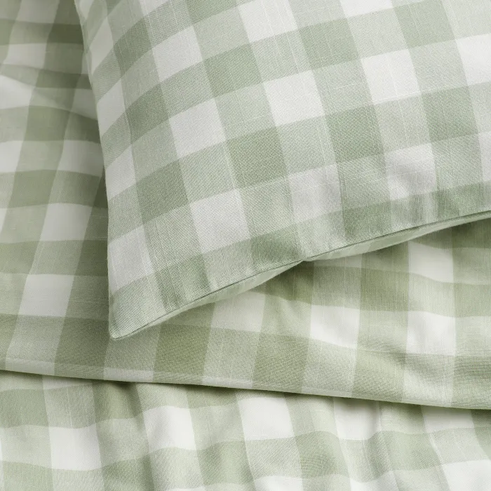 Набор постельных принадлежностей состоит из 100% органического хлопка с сертификатом GOTS. Этот натуральный материал передает воздух, поглощает влагу и приятен в контакте с кожей. Изготовлен из окрашенной пряжи с небольшой серо-зеленой и белой решеткой.
