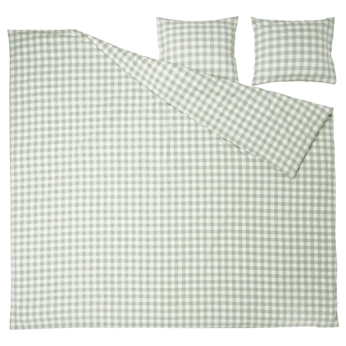 IKEA EKTANDVINGE(005.854.07) одеяло и 2 подушки, бледно-серо-зеленый белый/клетчат