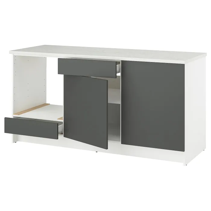 Включает в себя: шкаф, пятна, ящики, топ, ноги, плинтусы, полки, петли и фитинги.