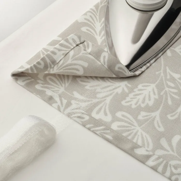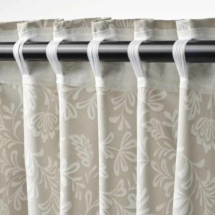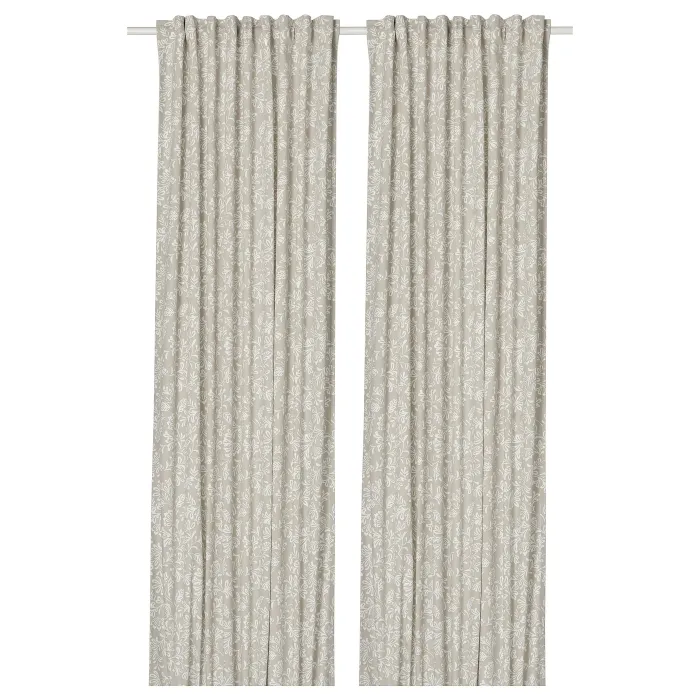 Шторы СНОРУТА с белым цветочным узором на бежевом фоне подходят к большинству интерьеров. Плотная ткань фильтрует дневной свет и обеспечивает конфиденциальность днем и ночью. Лента отлично подходит как для штанги, так и для рейки.