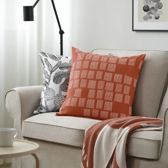 Эта оранжевая наволочка в небольших квадратах из тонких линий вносит во внутреннюю часть теплой энергии. Продукт изготовлен из хлопка, из которого по крайней мере 50% происходит от переработки. Он прекрасно сочетается с другими подушками из нашего предложения.