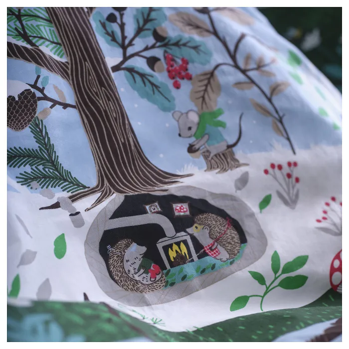 На мягкой двухпользованной печатной крышке для стеганого одеяла из смеси хлопка и вискозы, рыса смотрит на добычу плавания со своим молодым. Тем временем ежи сняли камин в их зимней норке под деревом.