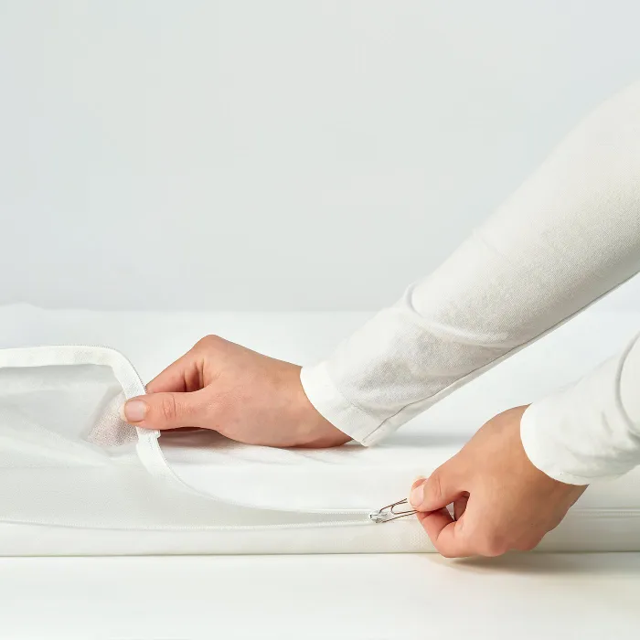 Матрас имеет одинаковую гладкую поверхность с обеих сторон. Если хотите, можете легко его перевернуть. Чехол можно чистить влажной тряпкой.