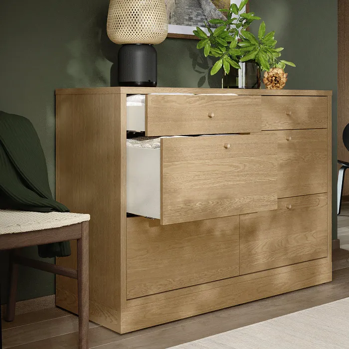 Этот широкий сундук с ящиками имеет 2 меньших и 4 больших ящика, в которых вы можете организовать свои вещи.