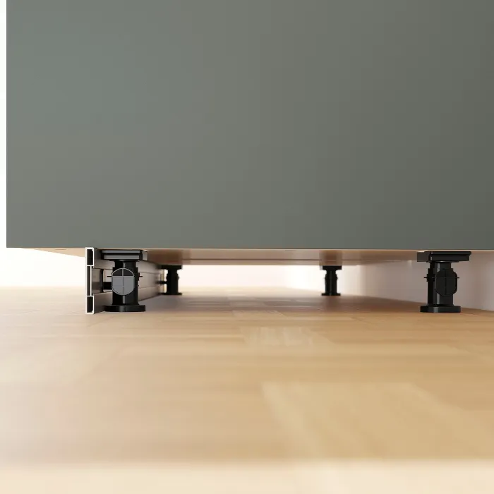 Чтобы обеспечить стабильность, ноги должны быть установлены под стоящими шкафами и высокими методами. Они могут быть точно скорректированы, чтобы уменьшить любое неравенство пола.
