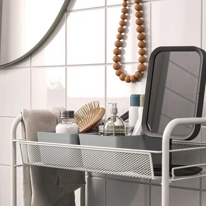 Это поможет организовать безделушки, которые обычно теряются, и он будет хорошо выглядеть как на полке, так и на шкафу в ванной.