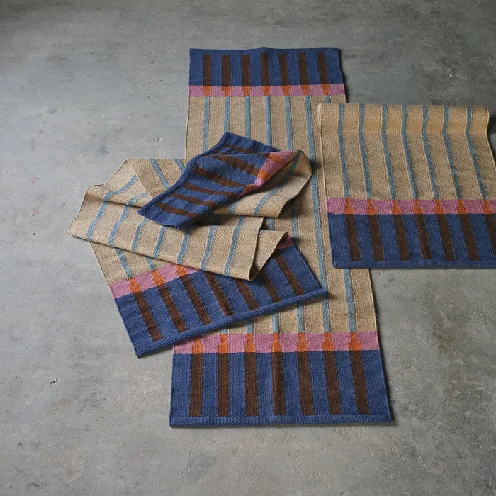Декоративный протектор с красочной пряжей, образующей полосатую узор на прочной джутовой ткани.