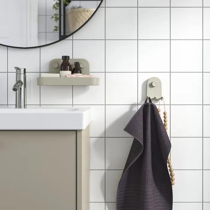 Аксессуары öbonäs - это решения для хранения, которые не требуют бурения в стенах. Вот как работает магия скрытых всасывающих чашек. Простой дизайн с гладкими, закругленными рогами в сочетании с серо -разгром, создает спокойный, современный эффект.