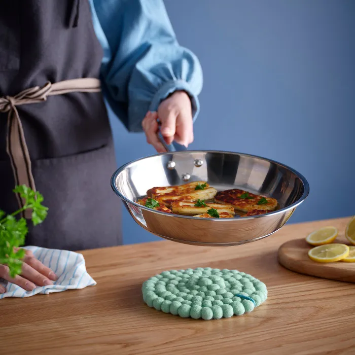 Светло -зеленая шерстяная подставка, которая защищает поверхность стола от царапин и высокой температуры. Вы можете легко повесить его с петлей с шерстяным мячом. Когда вы используете прокладку, скрыть мяч в отверстии в середине подставки.