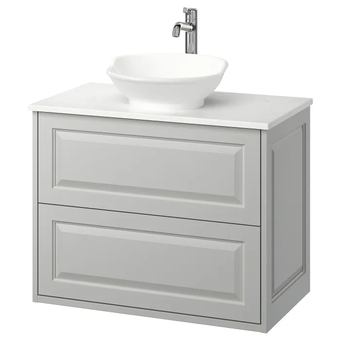 Мебель для ванной комнаты Tännforsen с очарованными краями излучает классическую элегантность. Комбинация с верхней и круглой раковиной с поднятым краем привлекает внимание красивым, ремесленным внешним видом.