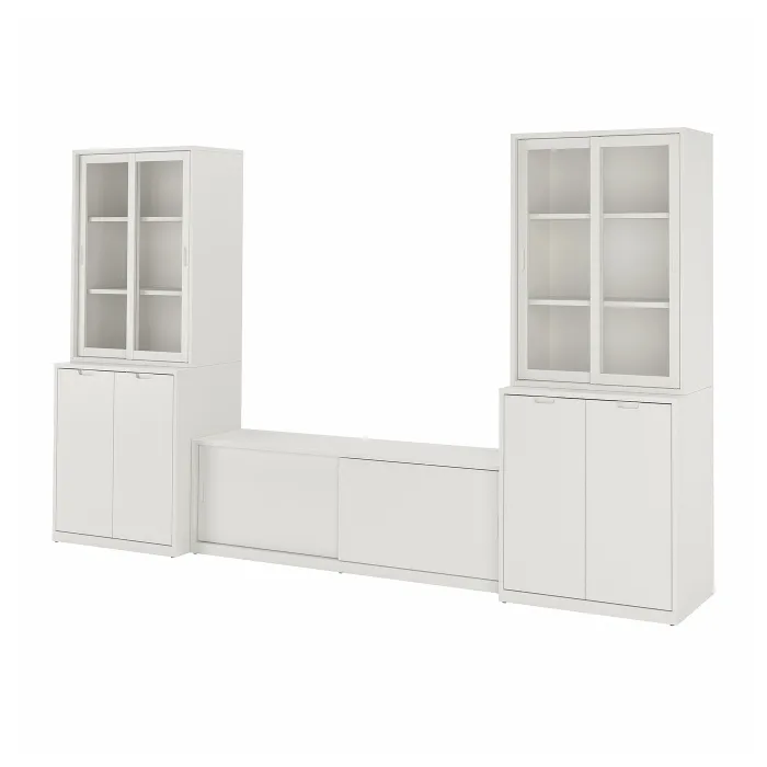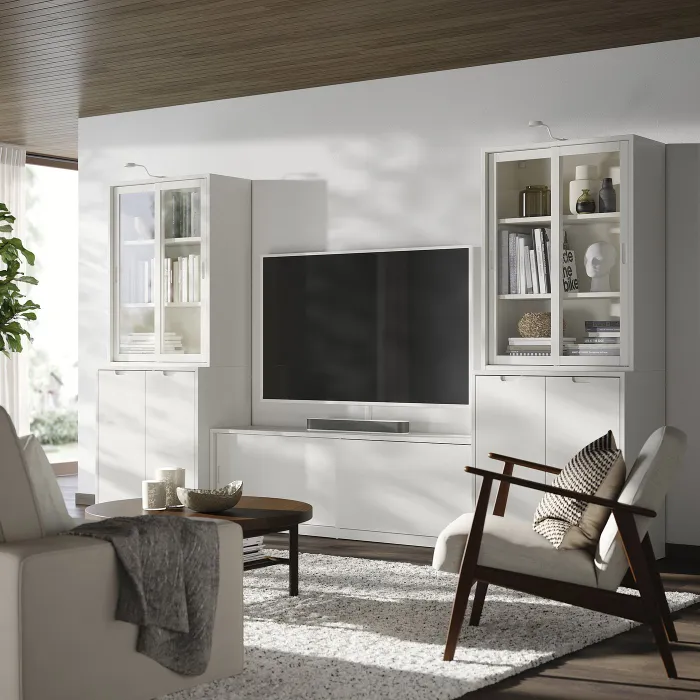 В серии Tonstad классический дизайн сочетается с восхитительной отделкой в кремовом цвете, что придает мебели драгоценный вид. Комбинация с телевизионным шкафом сохраняет заказ в кабелях, а шкафы позволяют скрывать некоторые предметы и отображать другие.
