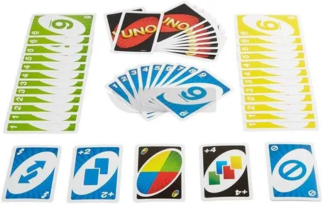 Карточная игра, состоящая из 108 карт 4 разных мастей и карт действий. Цель — как можно быстрее избавиться от своих карт в каждом раунде и заработать очки за карты, оставшиеся у других игроков. Побеждает тот, кто первым наберет 500 очков. После выкладывания предпоследней карты игрок должен крикнуть «УНО», что означает «один». Если игрок не крикнет и его «поймают», он забирает дополнительные карты. Количество игроков: 2–10.