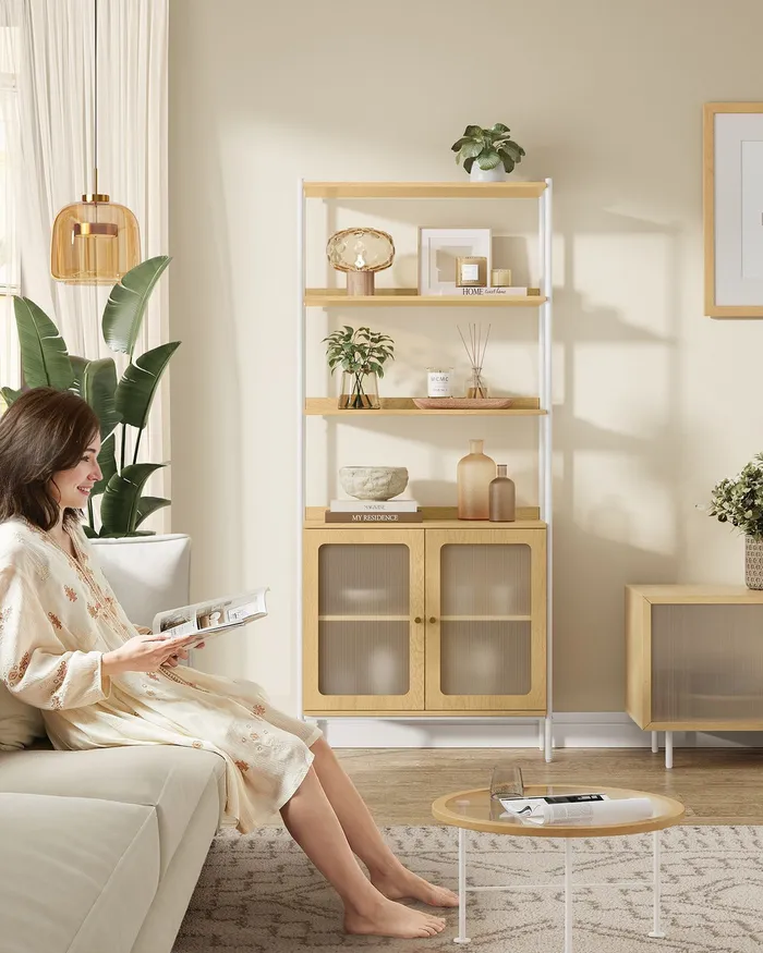 Широкая полка с прозрачным бежевым и белым шкафом
