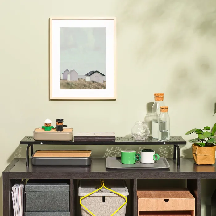 Як додатковий розділ у верхній частині полиці або всередині неї, підставка стає цікавою деталізацією, яка допомагає повністю використовувати вертикальний простір.