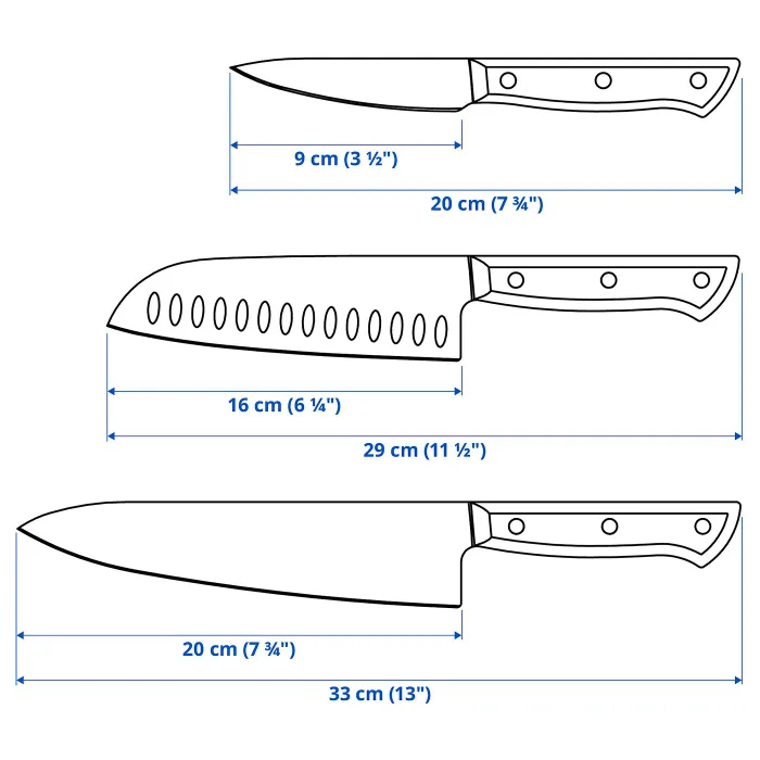 Включено: 1 шеф -кухар 20 см (загальна довжина 32 см), 1 нож Сантоку 16 см (загальна довжина 29 см) та 1 ніж для лущення 9 см (повна довжина 20 см).