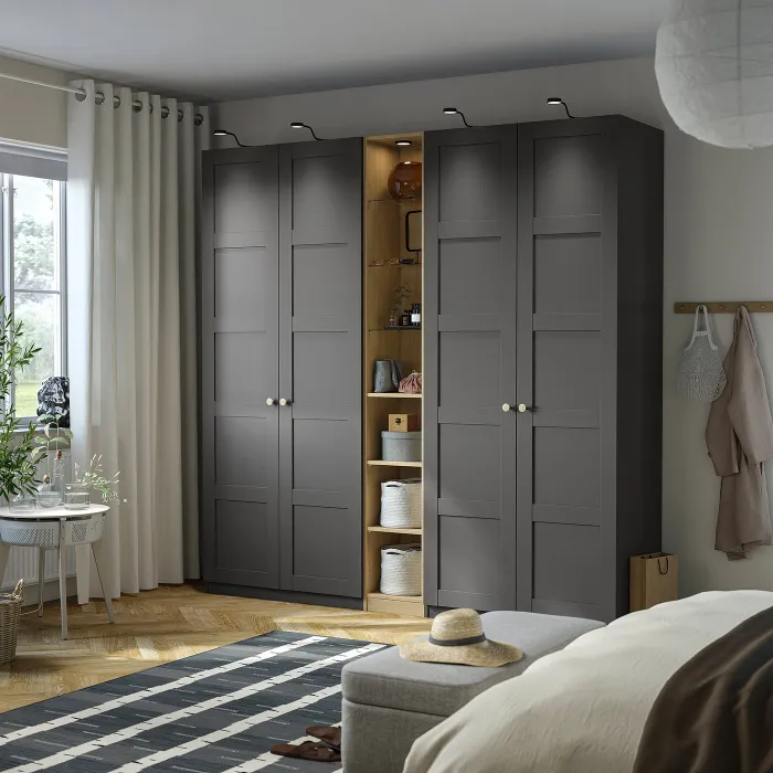 Можна використовувати з каркасами гардеробних ПАКС глибиною 35 і 58 см. Верхня частина містить додаткову панель, яка закриває простір між секцією та стіною, щоб нічого не впало за шафу, коли ви з’єднуєте секцію з корпусом глибиною 58 см.