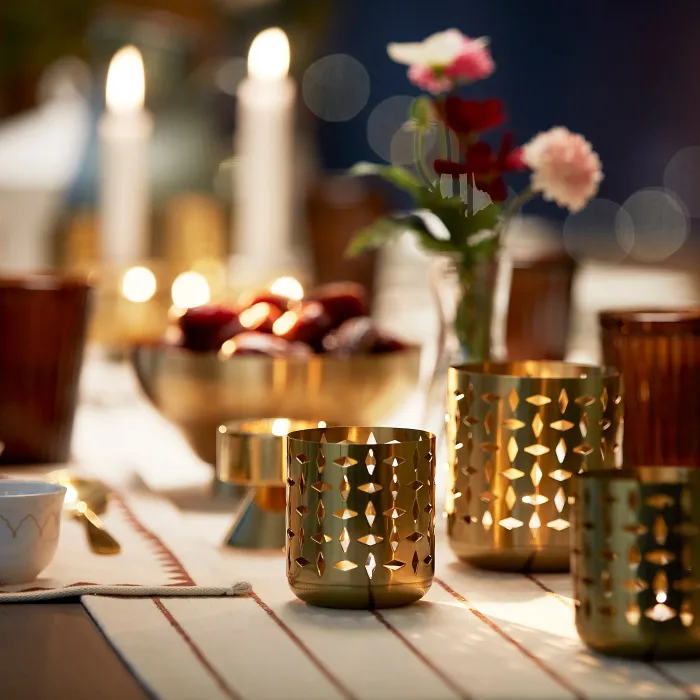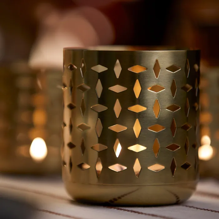 Створіть затишну атмосферу під час свого свята за допомогою елегантної підставки для чайних свічок, прикрашеної перфорованим візерунком із ромбовидними отворами, натхненними ґратами минулих років.