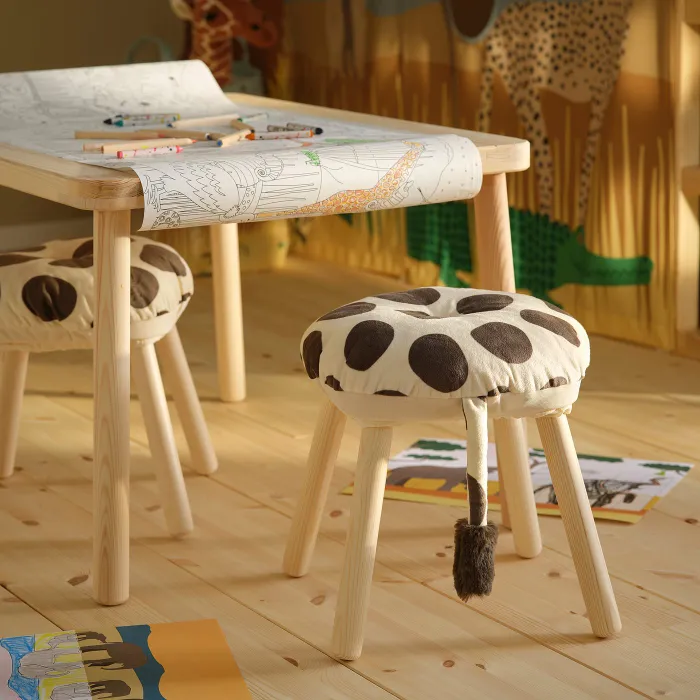 Перетворіть свій табурет MAMMUT або FLISAT на м'якого жирафа з хвостиком за допомогою веселого чохла з наповнювачем з переробленого поліестеру. Створіть мотив савани, використовуючи інші продукти з колекції SANDLÖPARE.
