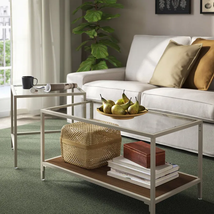 Акуратний легкий дизайн з елегантною бежевою рамою, стільницею із загартованого скла та полицею з горіхового дерева. Столи VITTSJÖ - ідеальне місце для демонстрації улюблених речей і вишуканий акцент в інтер'єрі.