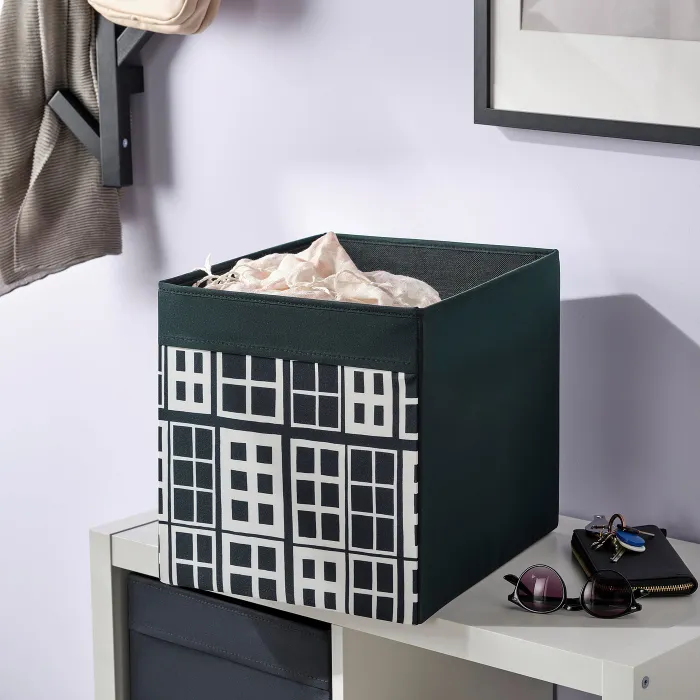 Шкатулка з тканини однаково добре підійде як у вітальні, так і в гардеробній. Ідеально підходить до полиці KALLAX. Вирішіть, чи відображати бік з малюнком, чи суцільний бік, або змішайте, якщо у вас кілька коробок.