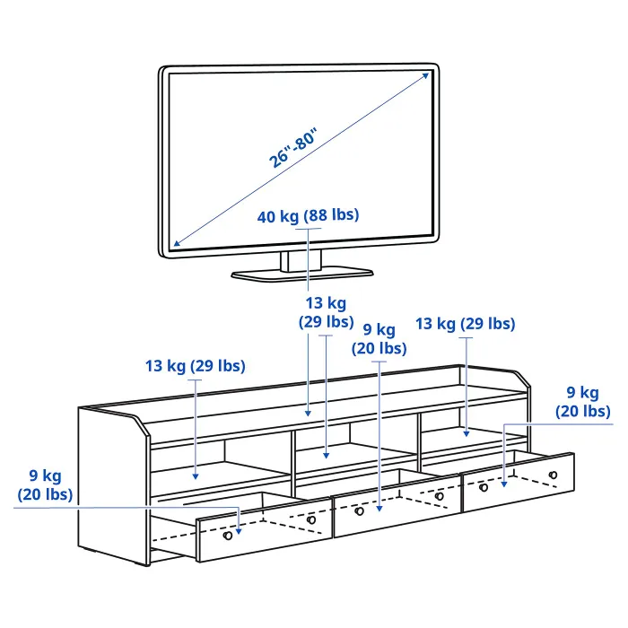 Тумба під телевізор повинна бути трохи ширше телевізора, який стоїть на ній. Тумба під ТВ підходить для телевізора з діагоналлю до 80 дюймів. Ви можете вибрати телевізор більшого розміру, якщо його вага не перевищує вказане максимальне навантаження на стільницю.