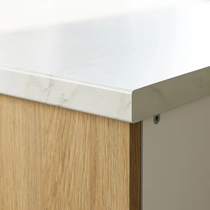 Фронти дуба імітації в поєднанні з білим вершиною імітації мармуру створюють чіткий ефект, який надає кухні затишний характер.