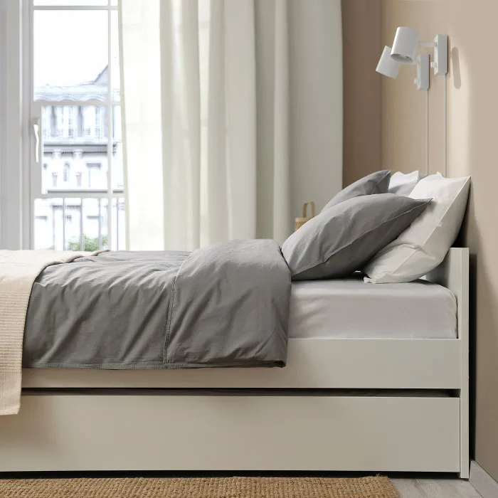 Проста, але функціональна рамка ліжка зі висувним ліжком для несподіваного гостя. Розумне рішення, яке відповідає іншим меблям із серії Vihals.