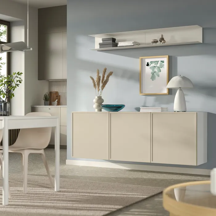 Ви можете легко встановити цю комбінацію шаф на стіні за допомогою настінних рейок, що входять у комплект. Це рішення створює враження легкості та звільняє простір на підлозі, а також пропонує практичне місце для зберігання.