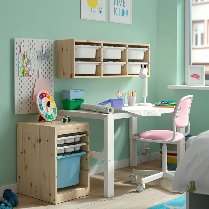 Дітям потрібні відповідні рішення для зберігання речей. Серія TROFAST включає дерев'яні рами, дротяні та пластикові контейнери, а також підноси (не менше 50% перероблених). Їх легко висунути, а потім знову засунути.