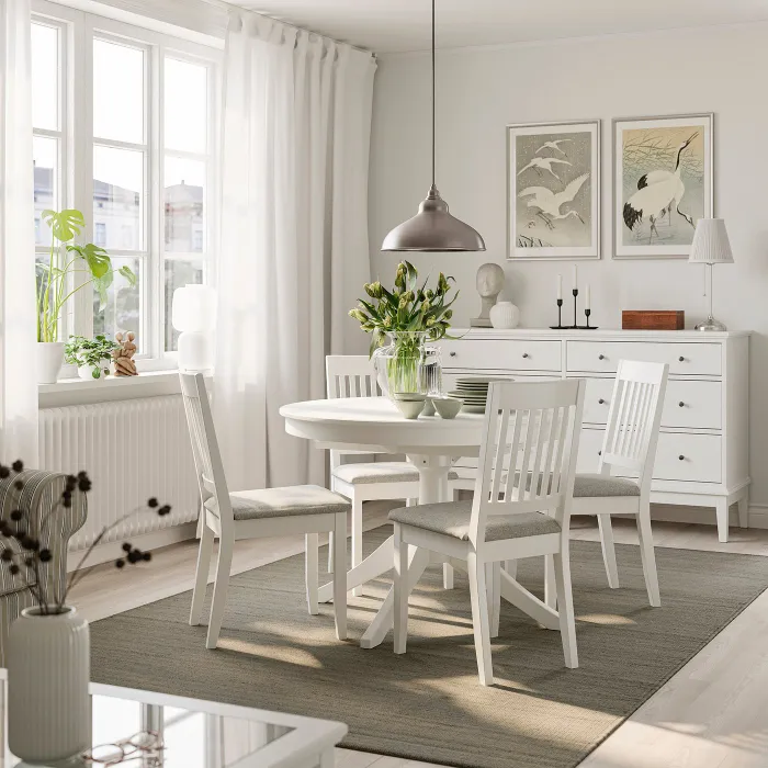 Красиві деталі, такі як скошені ніжки або спинка з ламелями різної товщини, надають кожному стільцю NÄSINGE гарний вигляд столу.