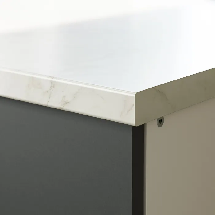 Темно -сірі фронти в поєднанні з білим вершиною мармурового імітації дадуть вашій кухні сучасного, затишного персонажа.