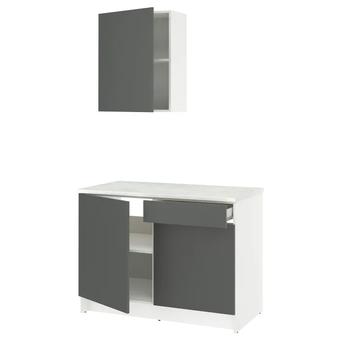 Темно -сірі фронти в поєднанні з білим вершиною мармурового імітації дадуть вашій кухні сучасного, затишного персонажа.