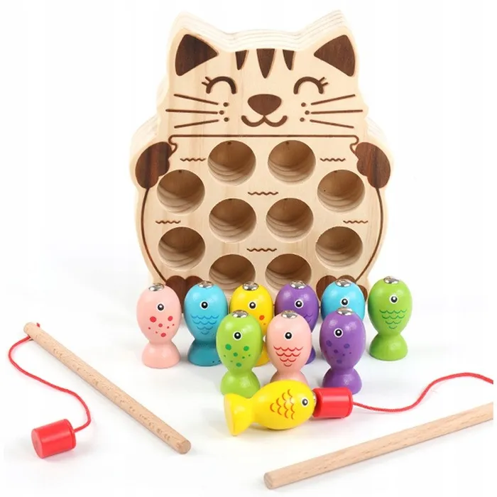 У набір входять різнокольорові рибки з магнітами, які ми піднімаємо за допомогою вудилища, а потім поміщаємо в отвори основи кота. Дитина може вільно рухатися і сортувати рибок. Така забава не набридне швидко! :)