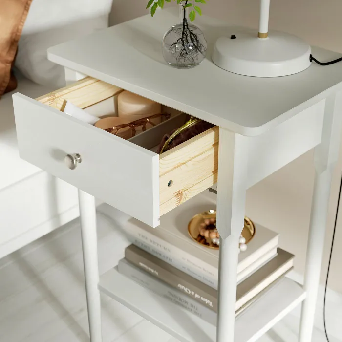 Тумбочка має верхню полицю, зручний ящик і відкрите місце для зберігання. Все, що потрібно для зберігання речей, які ви хочете біля свого ліжка.