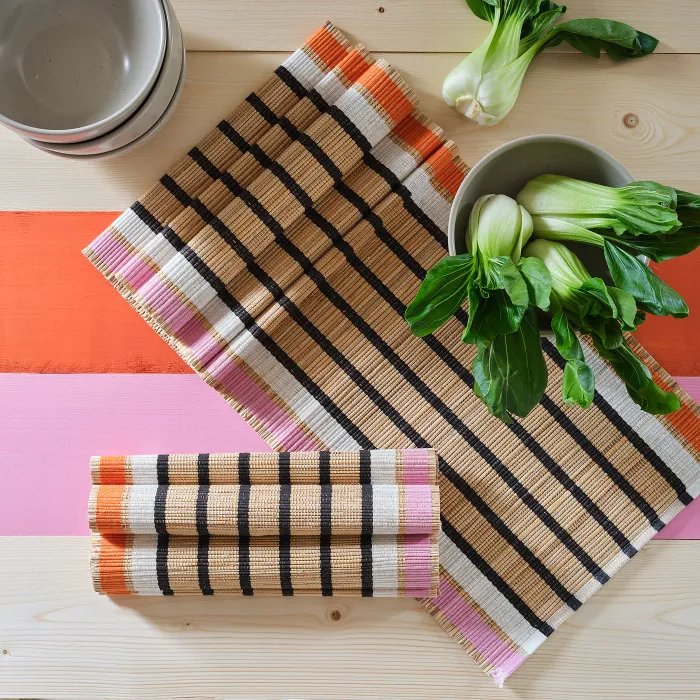 Доріжка ручної роботи дозволить створити природну, спокійну сервіровку столу. Сільські бананові волокна в поєднанні з м’якою бавовною створюють ефектні смуги. Унікальна прикраса, яка також захищає поверхню столу.