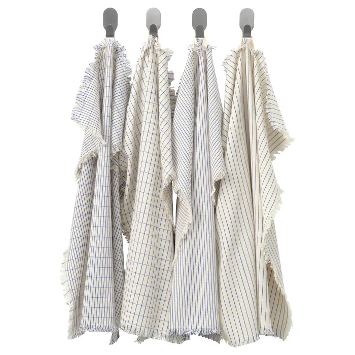 Красиві кухонні рушники в клітку та смужку з декоративною бахромою, що надає їм позачасовий характер.