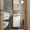 Шафка з дзеркалом над умивальником полегшує похід у туалет вранці і водночас візуально збільшує та освітлює ванну кімнату. Шафа з полицями забезпечує легкий доступ до часто використовуваних аксесуарів.