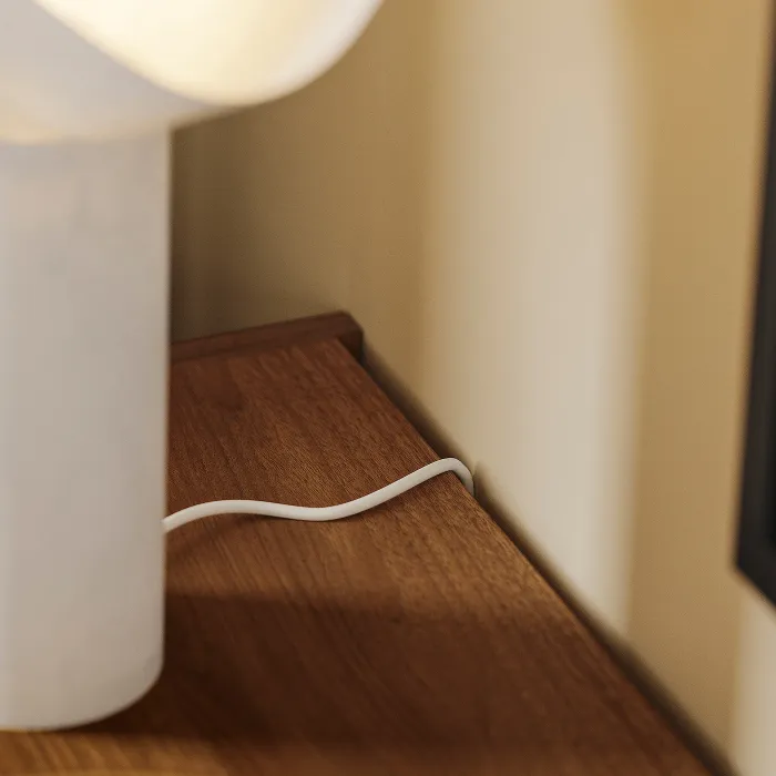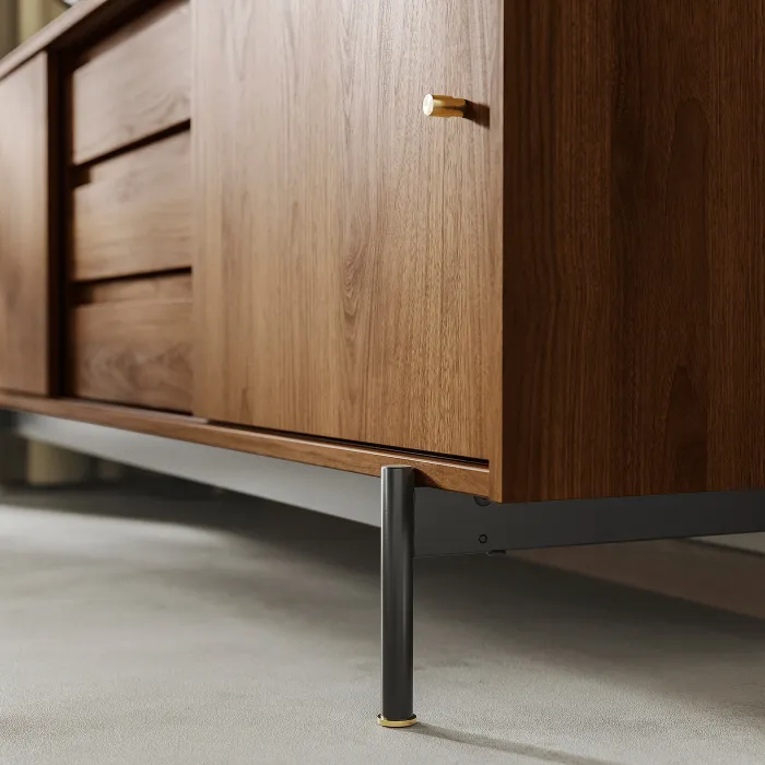 Верхня панель не досягає самого кінця меблів, створюючи спеціальний отвір для маршруту проводів. Це просте та ефективне рішення дозволяє встановити телевізор або лампу на шафу і не турбуватися про клубок проводів.
