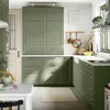 Матова поверхня фронтів у емпановій сірої зеленої гармонії та злегка вилучених панелей до плеча додає сучасну кухню традиційного характеру, яка створює в ній спокійну, але виразну атмосферу.