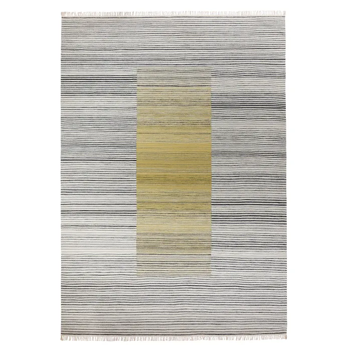 Гладкий вовняний килим ручної роботи із сучасним візерунком у сірих тонах із жовтими акцентами. М'які бахроми на більш коротких краях. Ідеально підходить для вітальні, поруч із ліжком або під обіднім столом.