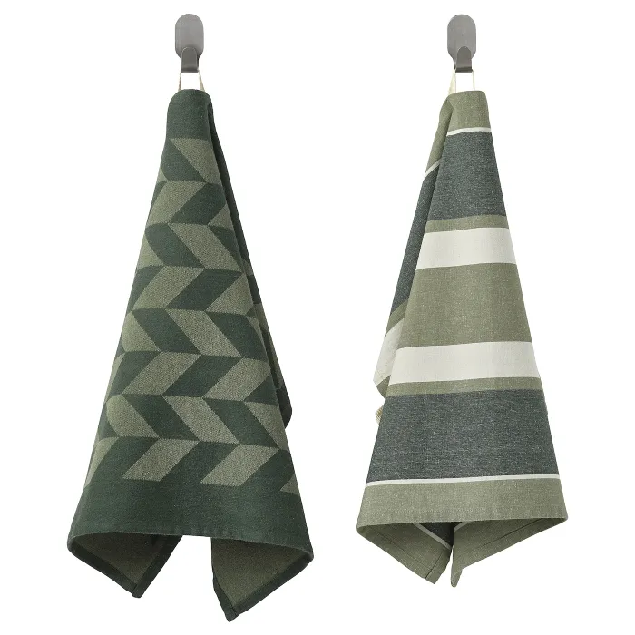 Зроблені з вбиткової бавовняної суміші та джутових тканин будуть чудово працювати на кухні, коли ви хочете витерти посуд або коли щось розливається. Вони також виглядають красиво, бо мають декоративний мотив у приглушених відтінках.