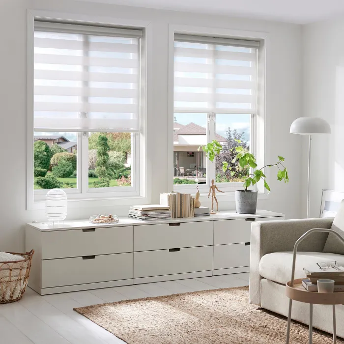 Подвійну штору легко піднімати і опускати. Ви також можете регулювати кількість світла, що надходить, і ступінь прозорості, миттєво перемикаючись із режиму шторки на шторку. Розумно, правда?