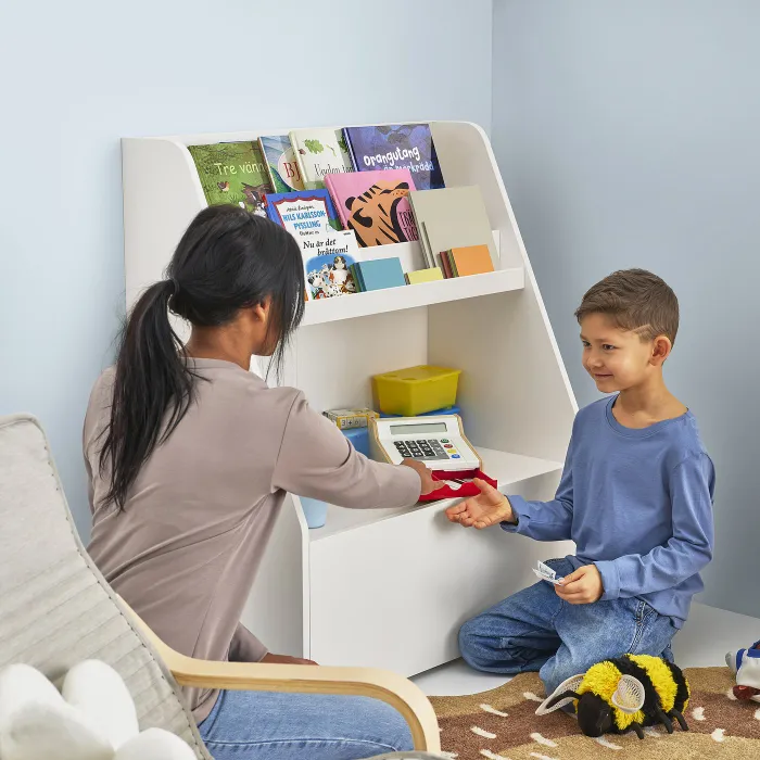 Практичне зберігання в невеликому просторі з полицею для книг вгорі та полиці та ящику внизу, де є місце для іграшок, ігор та ще більше книг.