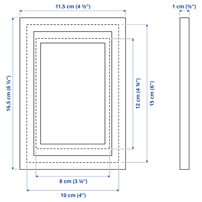 Ця рамка вміщує фотографії розміром 8x12 см, якщо ви використовуєте її з паспарту, і фотографії 10x15 см, якщо ви вирішите використовувати її без паспарту.