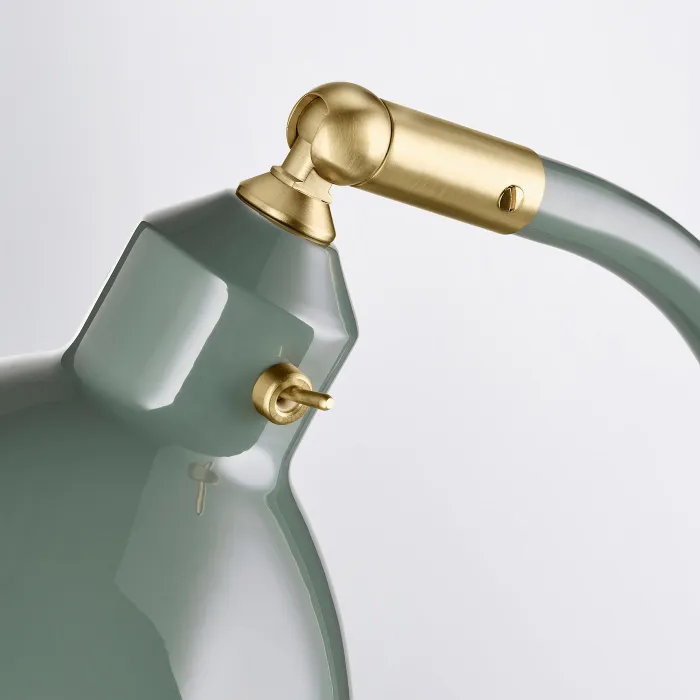 Настільна лампа з блискучою поверхнею, що нагадує емаль і деталі в латньому кольорі. Подвійний перемикач на регульованій лампах був натхненний старими промисловими лампами. Не тільки практично, але й декоративні.