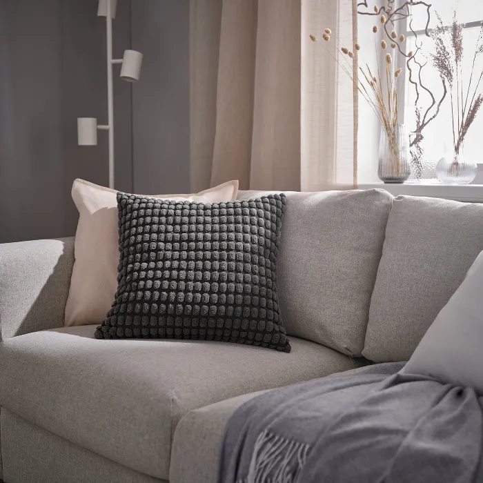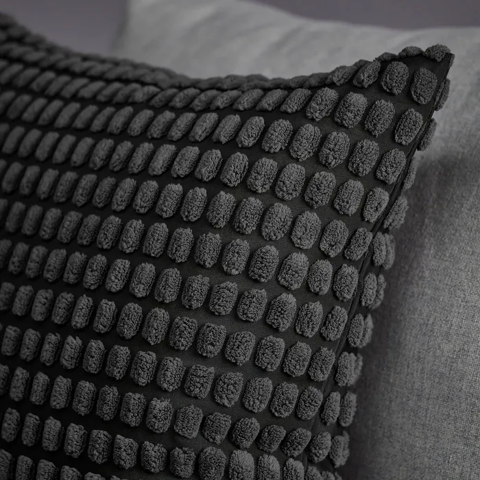 Надзвичайно м'яка подушка кольору антрацит з опуклим візерунком, що підкреслює різницю відтінків між тканиною та пухом. Вибирайте з широкого асортименту доступних кольорів або комбінуйте кілька різних. Виріб на 90% складається з переробленого поліестеру.