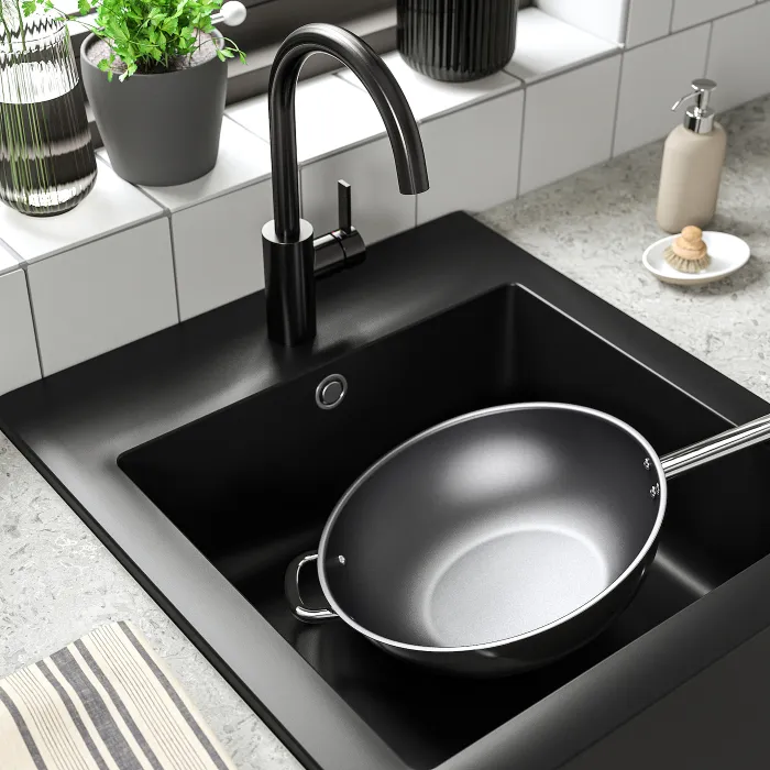 Раковина з видимим фронтом чорного кварцового композиту додає інтер'єру непокірного шарму заміського будинку. Глибока одиночна камера полегшує миття більших суден і каструлі, не розливається.