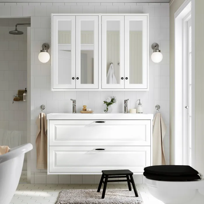 Меблі для ванної кімнати ТЕННФОРСЕН випромінює класичну елегантність завдяки своїм скошеним краям, які надають їй вигляду ручної роботи. У цю комбінацію входять 2 місткі ящики і подвійна раковина, яка легко впорається з ранковою суєтою.