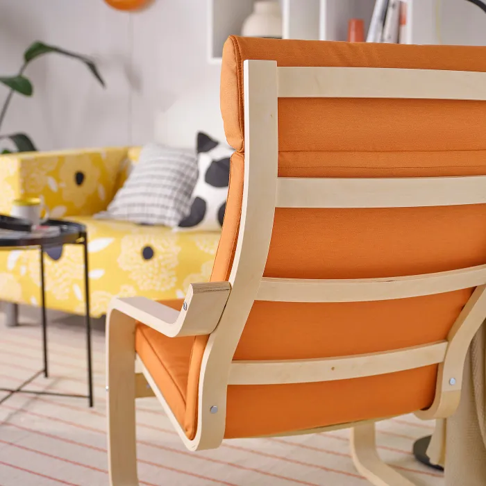 Ось крісло Poäng у смішному, енергійному помаранчевому кольорі! З іншого боку, вигнуті лінії, підтримка шиї та еластичний комфорт залишаються незмінними. Наша порада: Додайте на підставку для ніг, щоб ваші ноги мали комфортну підтримку.
