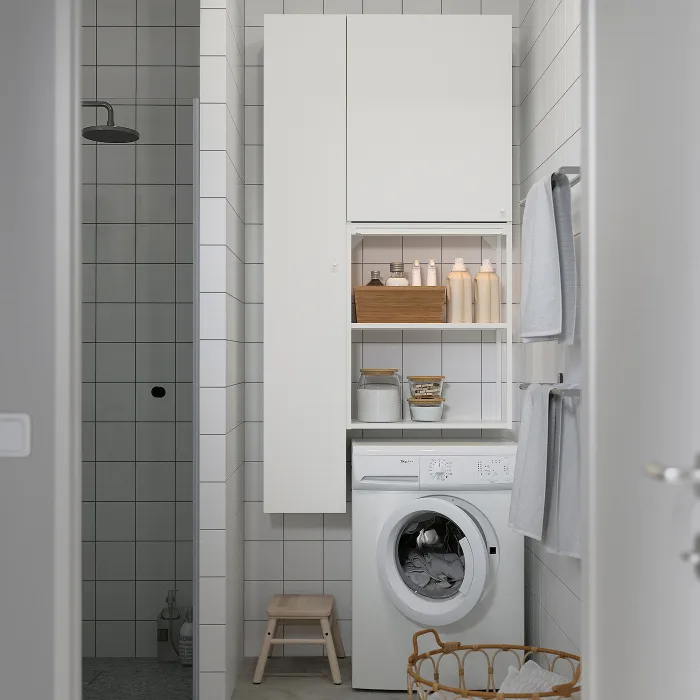 Відкритий настінний каркас дозволяє розміщувати миючі засоби в безпосередній близькості до пральної машини.